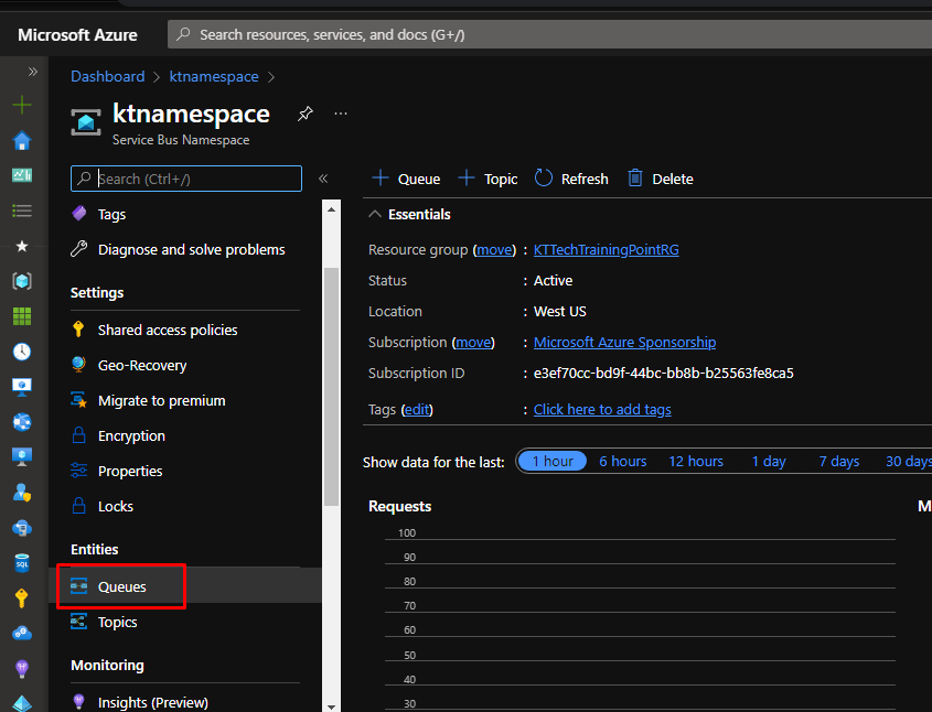 Once your namespace gets created, you will see that you can have queues and topics in it. Go to queues.