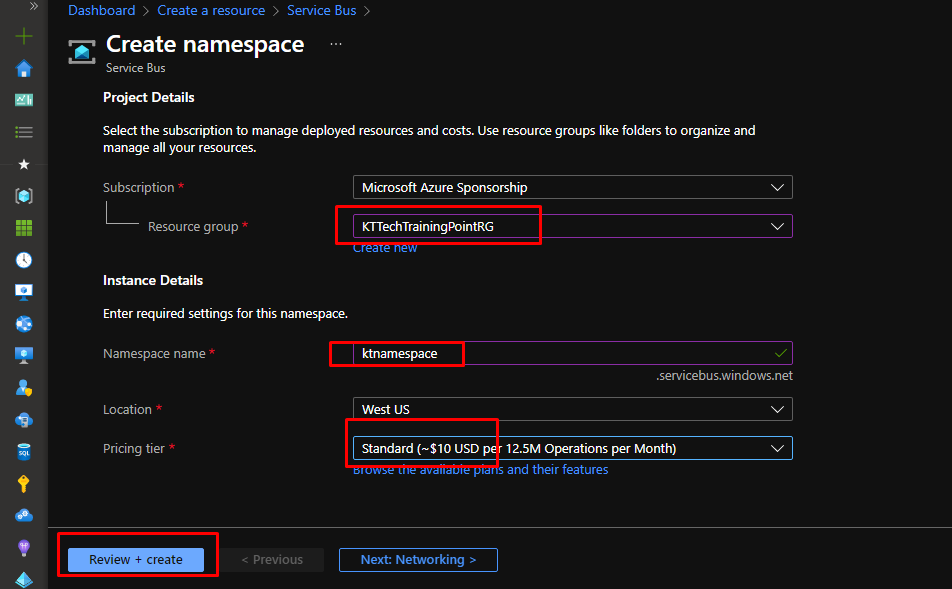 Put the namespace in a resource group. Give your namespace a name. For this demo, Standard pricing tier is good. Click Review + Create and then click create,
