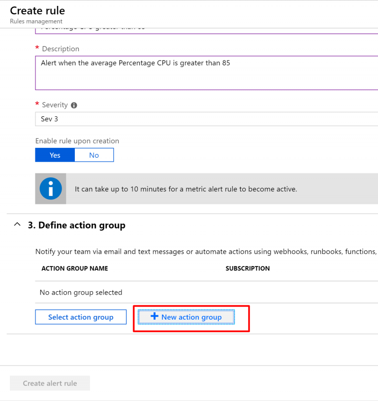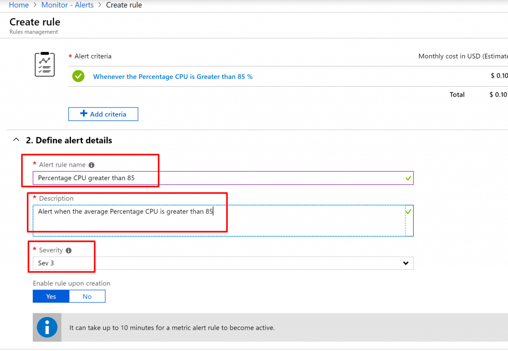Step 11) In the alert details, give the alert rule name as shown below and give it logical description. Keep the severity as Sev 3.