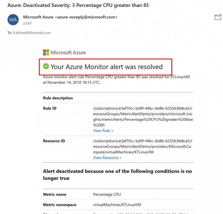 Step 23) Then you will receive an email stating that the Monitor alert was resolved.