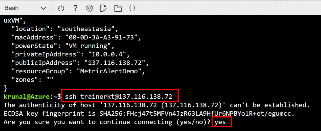 Step 4) Run the following command to create a VM. This will create a VM with the name KTLinuxVM in the resource group MetricAlertDemo of the image UbuntuLTS and of size Standard DS1_v2. It will also generate SSH Keys so that you can connect to the VM using SSH. The last parameter is the admin username which trainerkt.