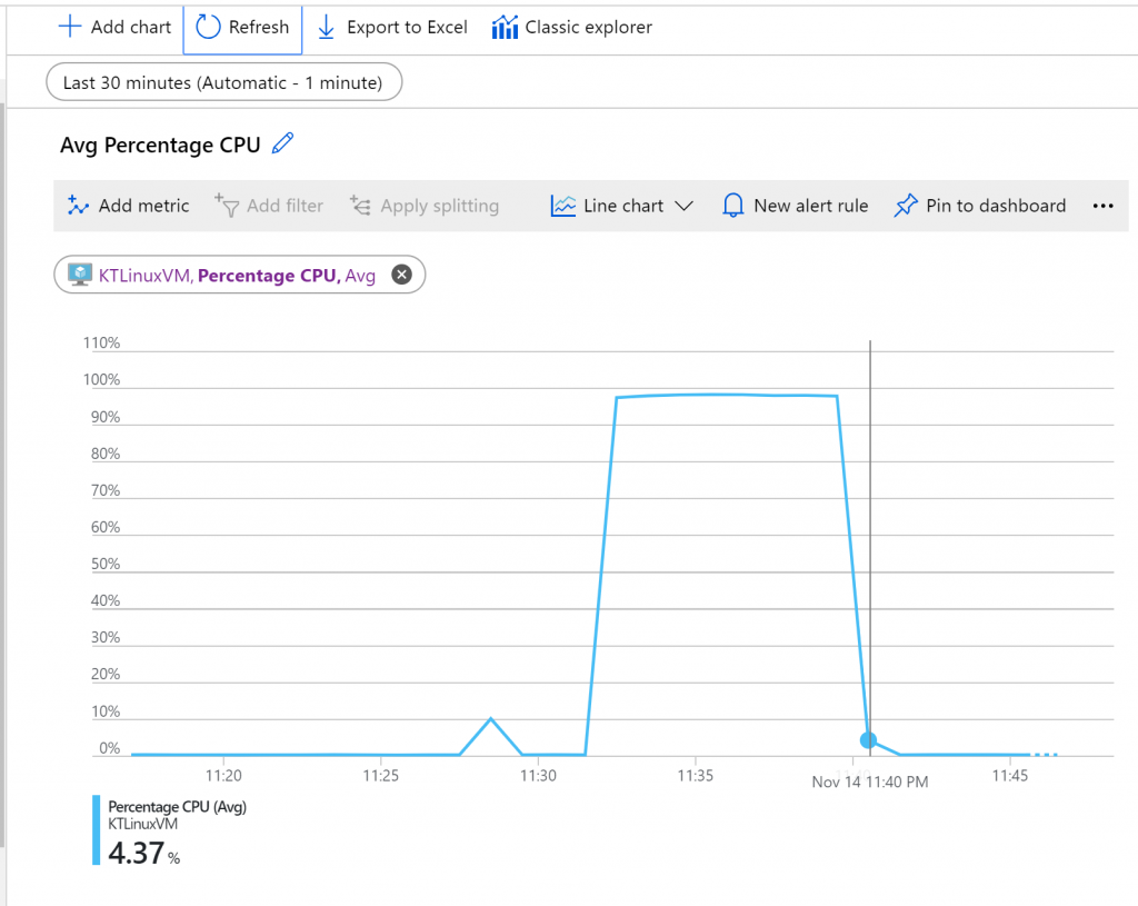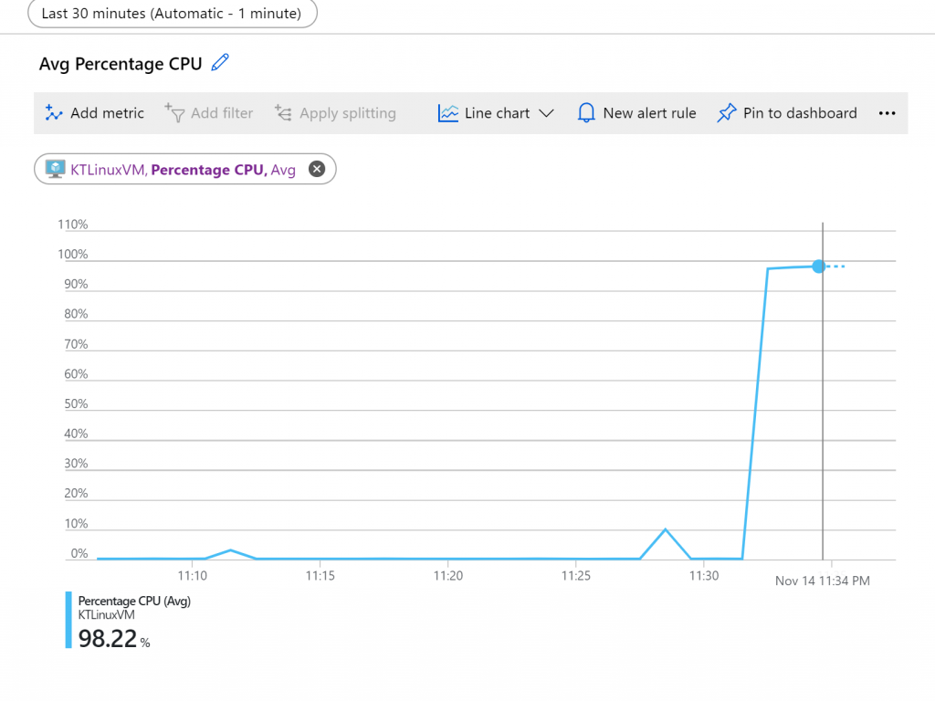 Step 19) While you are waiting for the email, go to the Metrics tab. Select a time range of Last 30 minutes, select KTLinuxVM as the resource, select Virtual Machine Host as the metric namespace, select Percentage CPU as the metric and Avg as the aggregation. Initially, it will show you a graph like the one shown below. Where you will see that the maximum CPU threshold would be around 10-15%.