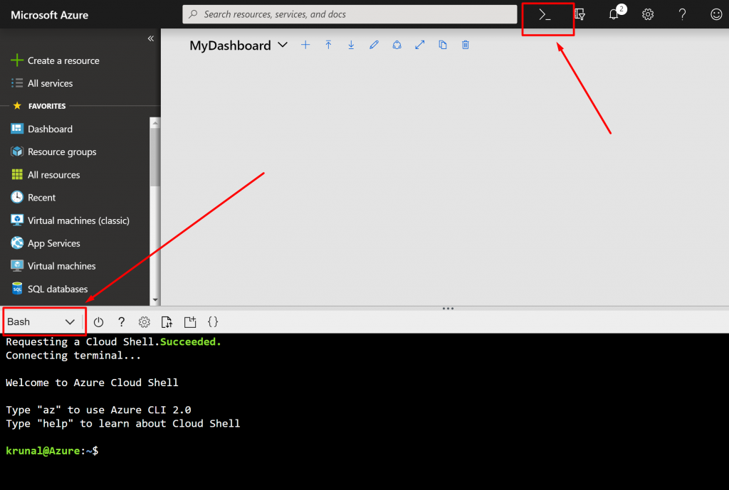 Step 3) Click on ‘>_’ icon to connect to the Cloud Shell. Switch to Bash.