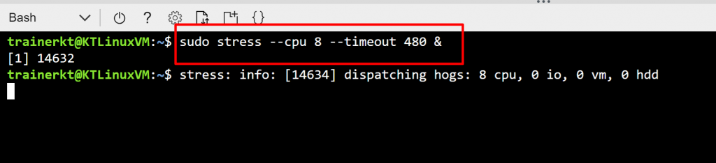 Step 18) Then run the following command. This command generates a CPU load on the virtual machine specifying 8 cpu hogs for a period of 480 seconds.