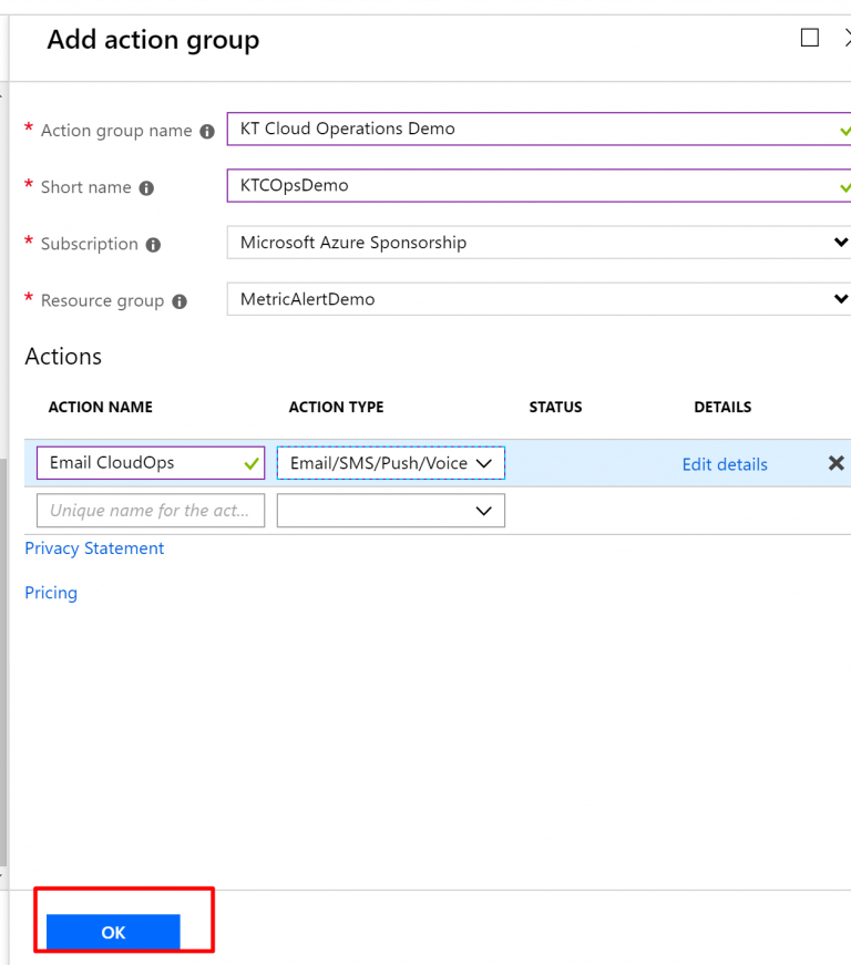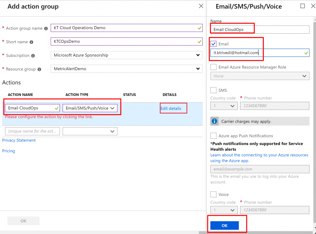 Step 14) In the actions section, give name to the action as Email CloudOps and select the action type as Email/SMS/Push/Voice. It will open up a new blade. Enter your valid Email ID to receive an email of the metric alert. Additionally, you can also provide phone details to receive an SMS alert. It is same for Push and Voice services as well. Click on OK.