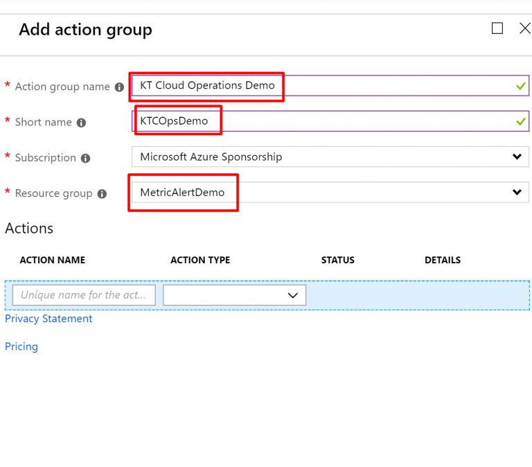 Step 13) Give the action group a name and also give it a short name. Keep the subscription same as the resource group that you have created and select the same resource group as well.