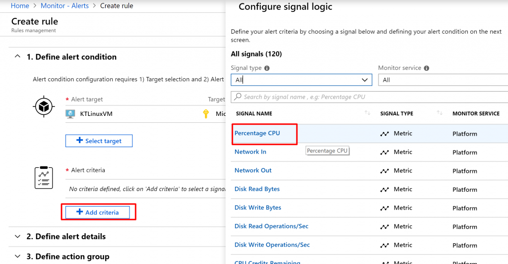 Step 9) Then, click on Add Criteria to define a new criteria. Select Percentage CPU from the list of Signal Names.