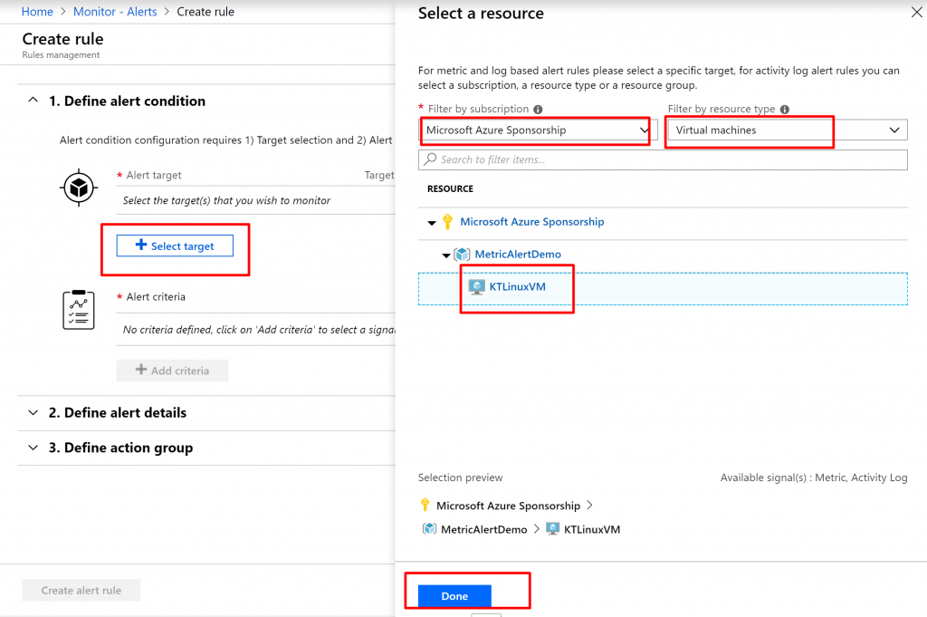 Step 8) Click on Select Target. It will open up a new blade. Find your VM that you just created and select that. Click on Done.