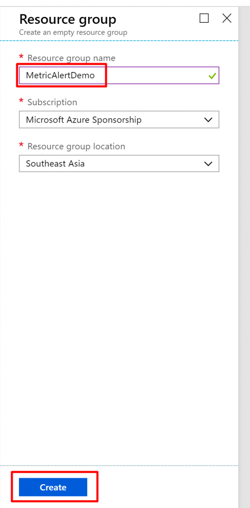 Step 2) Give name MetricAlertDemo to the resource group, select an appropriate subscription and resource group location. Click on Create.
