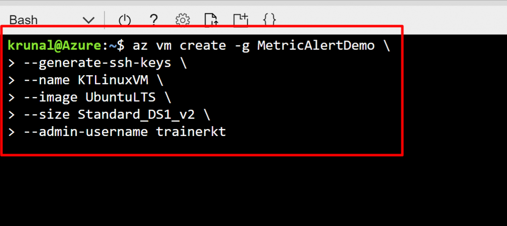 az vm create -g MetricAlertDemo --generate-ssh-keys --name KTLinuxVM --image UbuntuLTS --size Standard_DS1_v2 --admin-username trainerkt