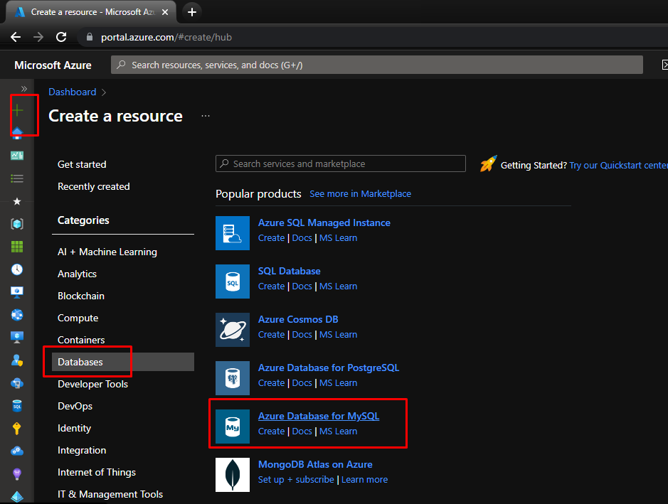 Go to Azure Portal Create a new resource Databases Azure Database for MySQL