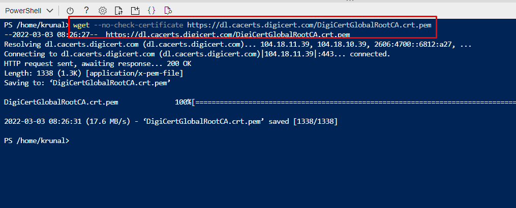 You can connect to the server the you like. Here we will be connecting to it via the cloud shell. Open cloud shell and run the certificate command.