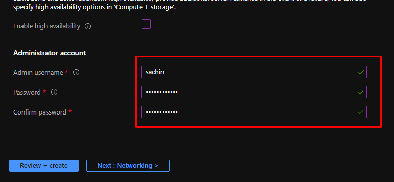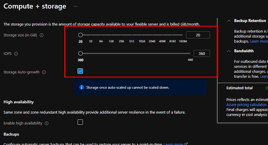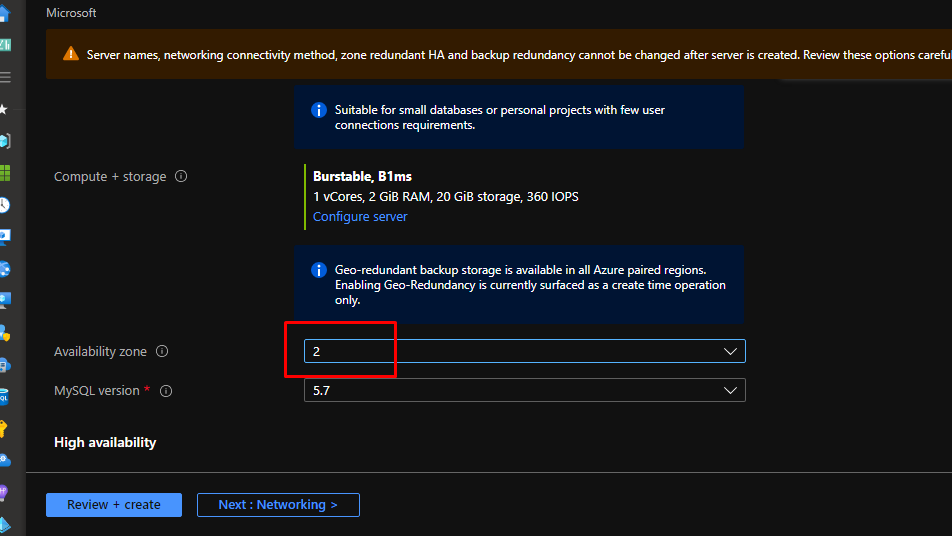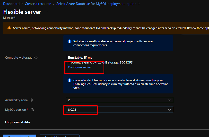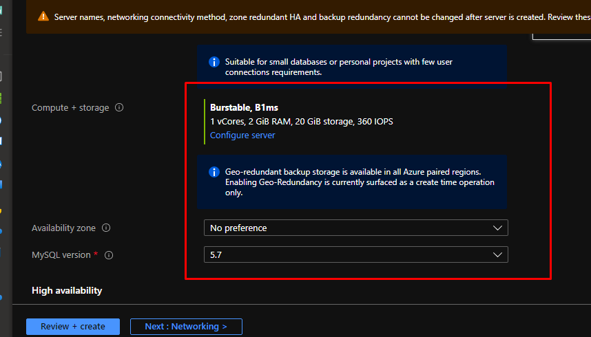 This part preconfigures the settings for you. With Flexible server, you have high control over high availability.