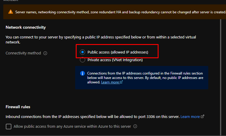 The Flexible Server enables you to put the server in a virtual network in order to further enhance your security. However, we are going to with public access only.