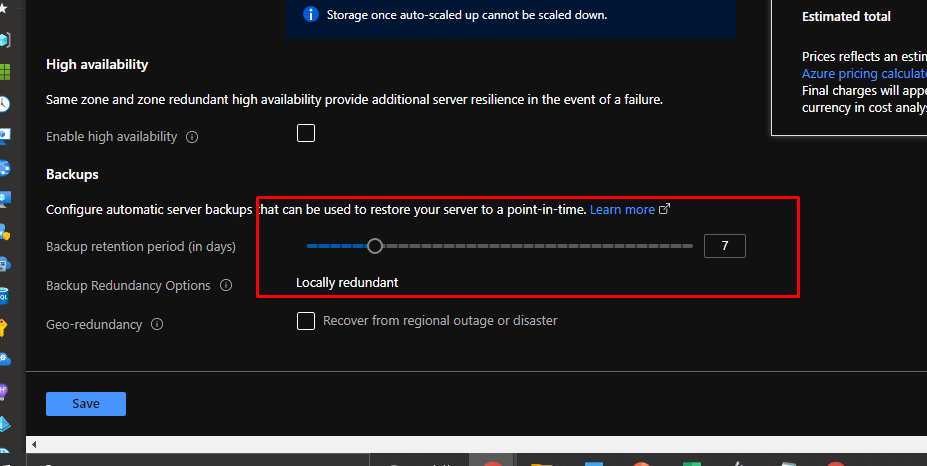 Here you can configure backup retention and redundancy. Right now, we can only choose locally redundant option because we are using the burstable compute tier.