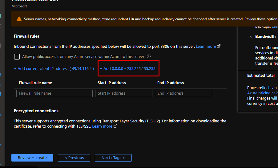 When you choose that option, you use firewall for security purposes. For now, add this blanket IP mask that will allow me to connect to the server. This is not recommended to do in a real world scenario. This should be done only during development or demonstration. Click Review + Create and Create.