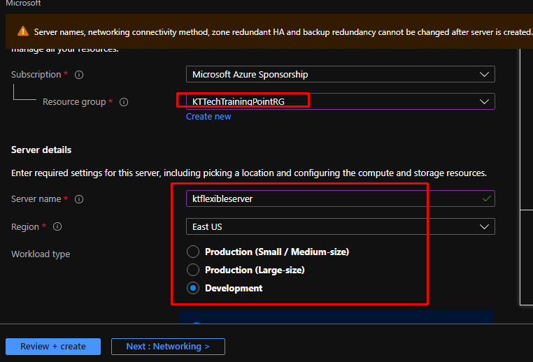 Put the database in a Resource Group, give your server a name, choose the region and for the workload type, choose Development.