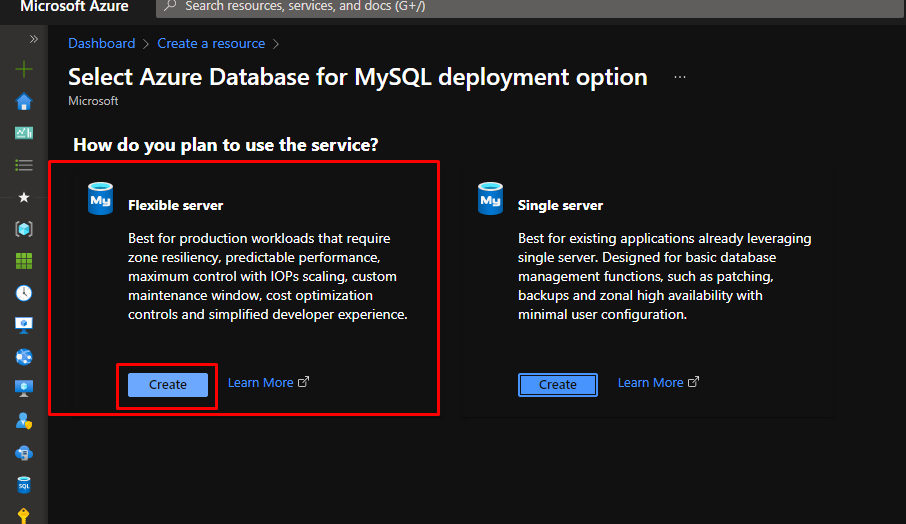 Now you can create an Azure Database for MySQL Server with a Flexible Server.