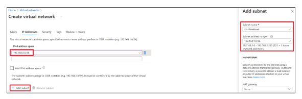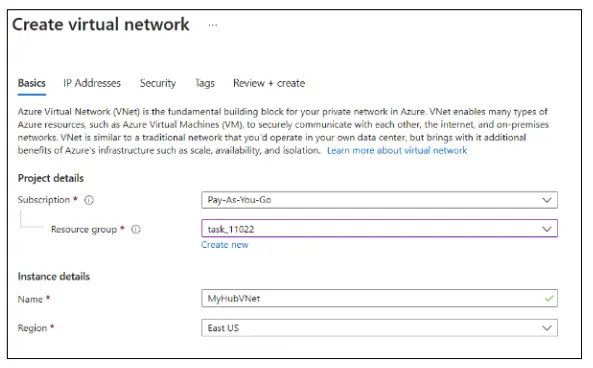 In the Create Virtual Network page, enter these details in the Basics tab