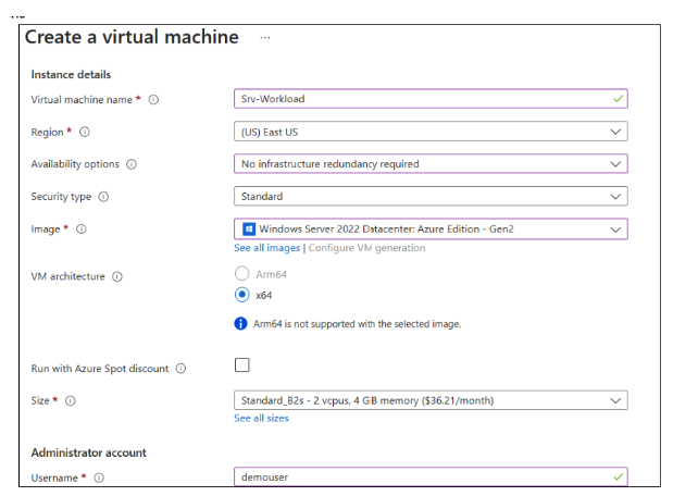 In the Create a Virtual Machine tab, provide the following values in the Basics tab