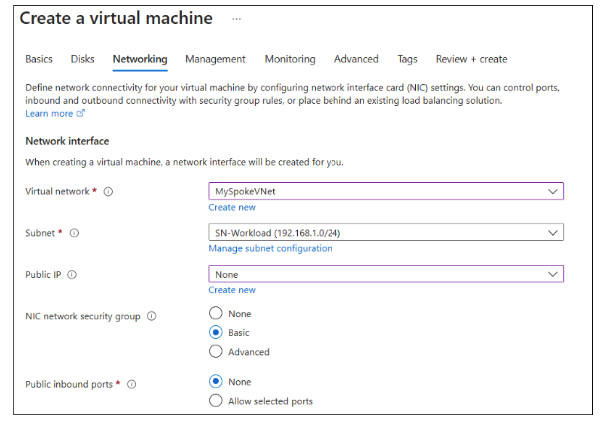 In the Create virtual network page, provide the following details in the Basics tab Resource group, Name, and Region.