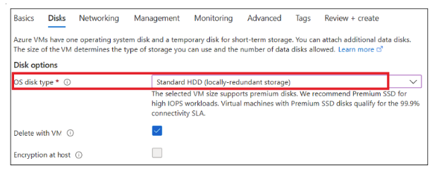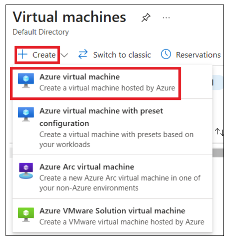 In the Virtual Machines tab, click + Create, then select Azure virtual machine.
