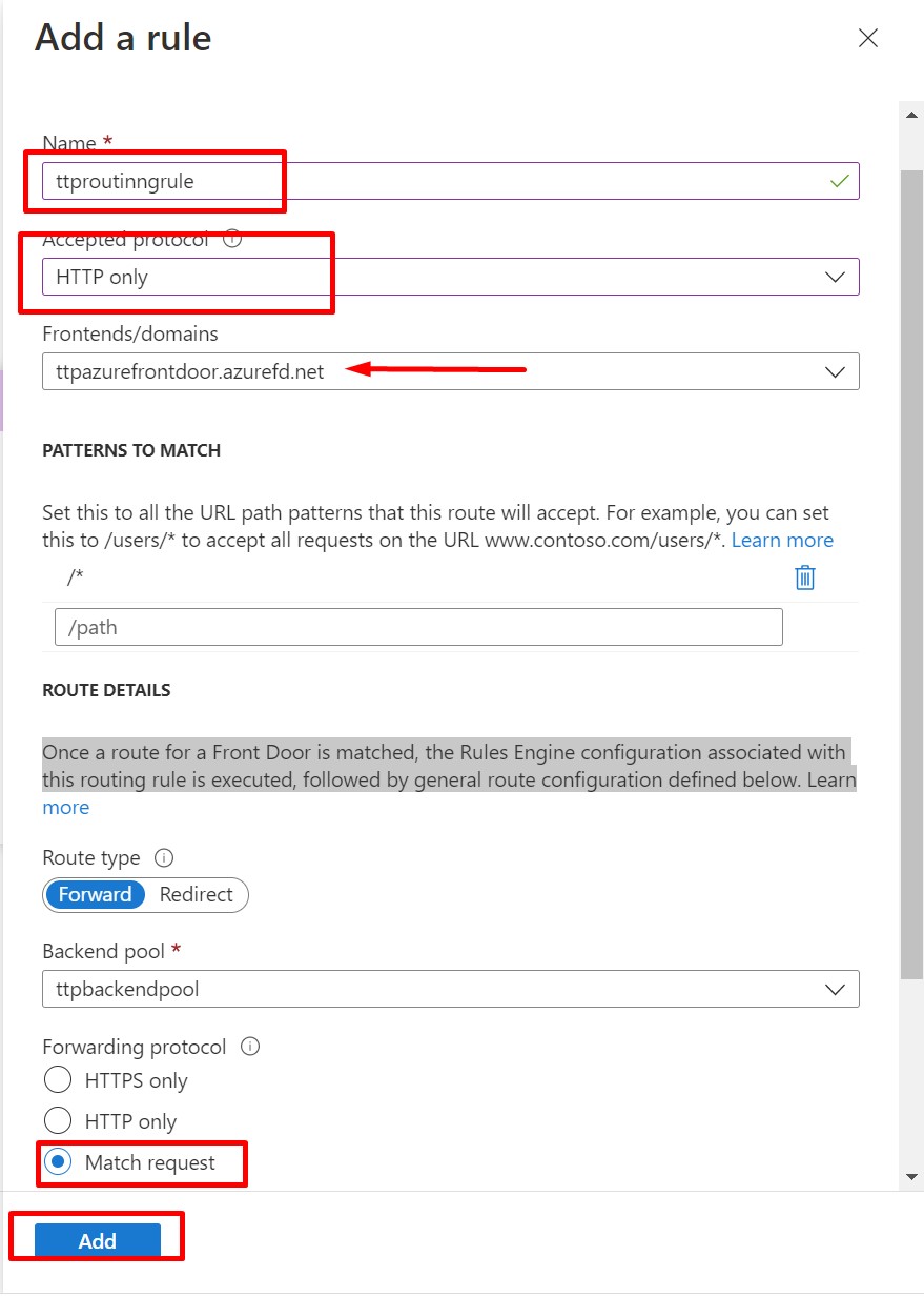Next, we provide the rule name, accepted protocol would be HTTP only. Here you would be seeing Azure Front Door. For the forwarding protocol select Match Request. Finally, click on Add.
