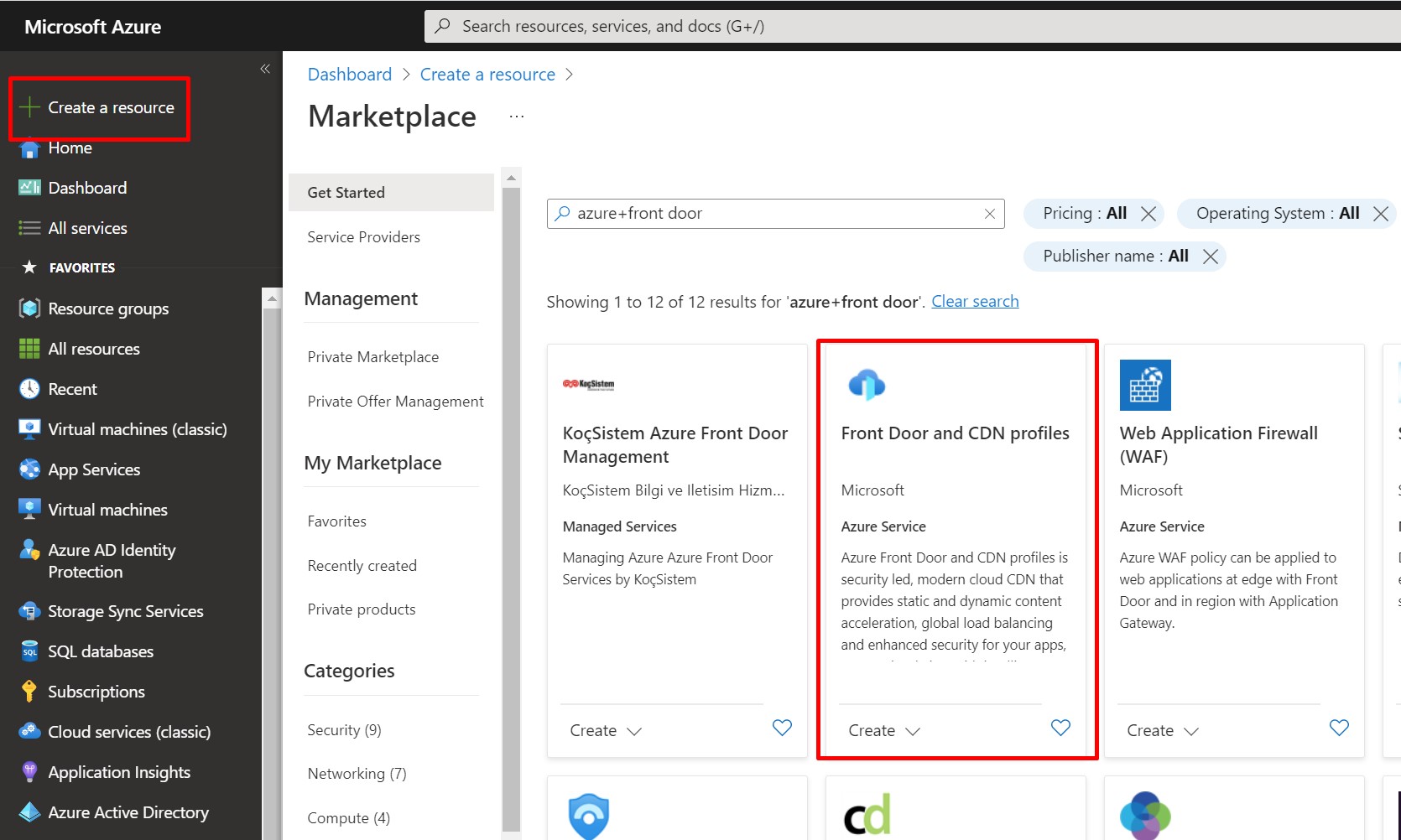 Now, we will create Azure Front Door instance. Click on Create Resource and Search for Azure Front Door. Select Front Door and CDN Profiles.