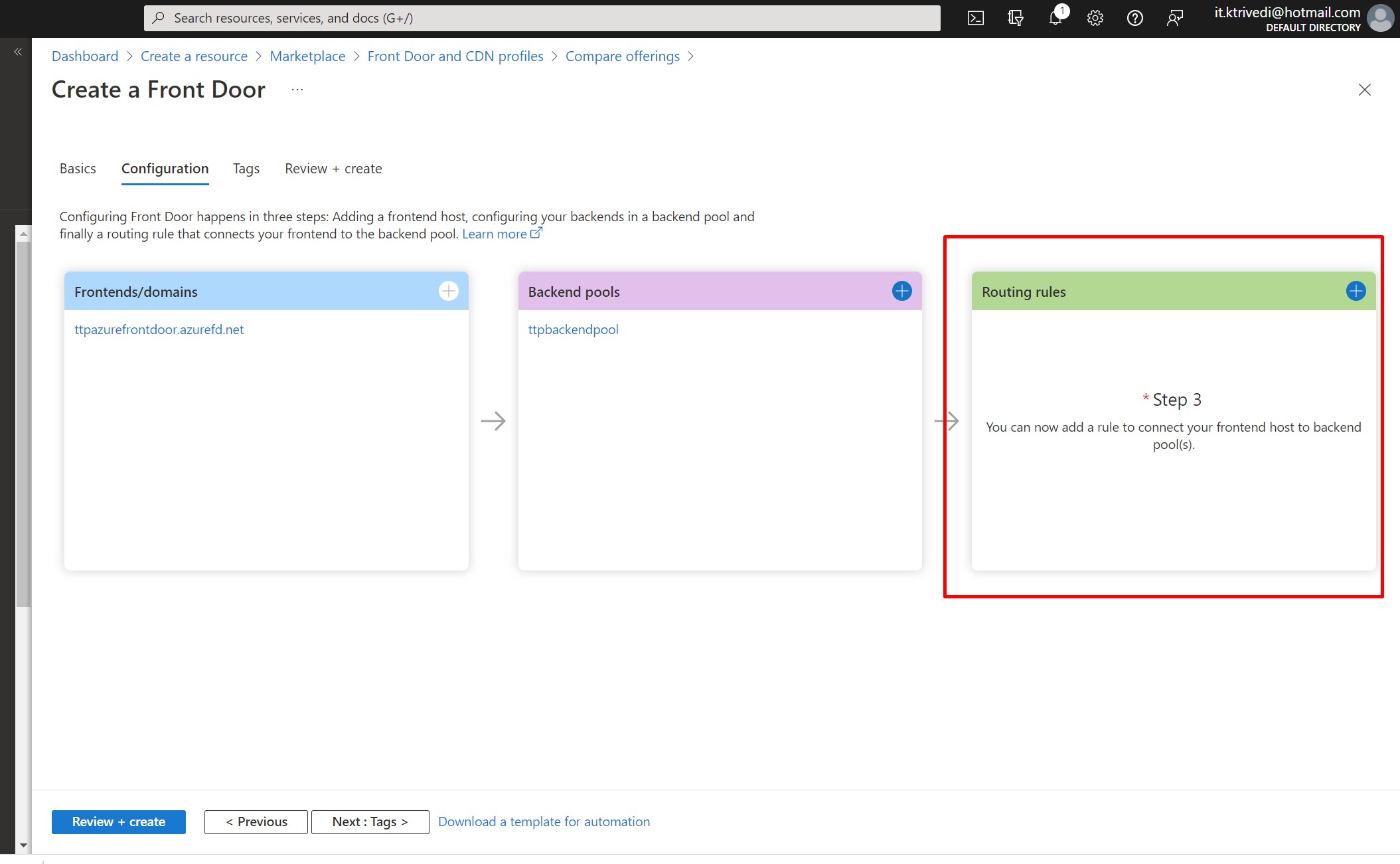 Once, the routing rule is provisioned, click on Review + Create and finally click on Create.
