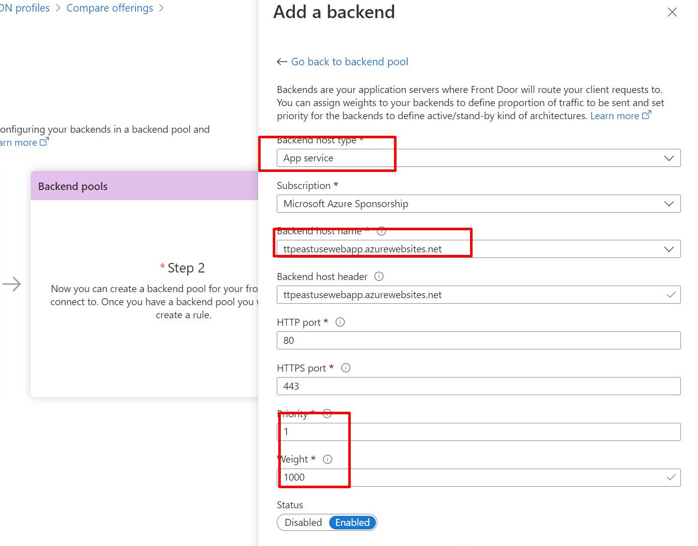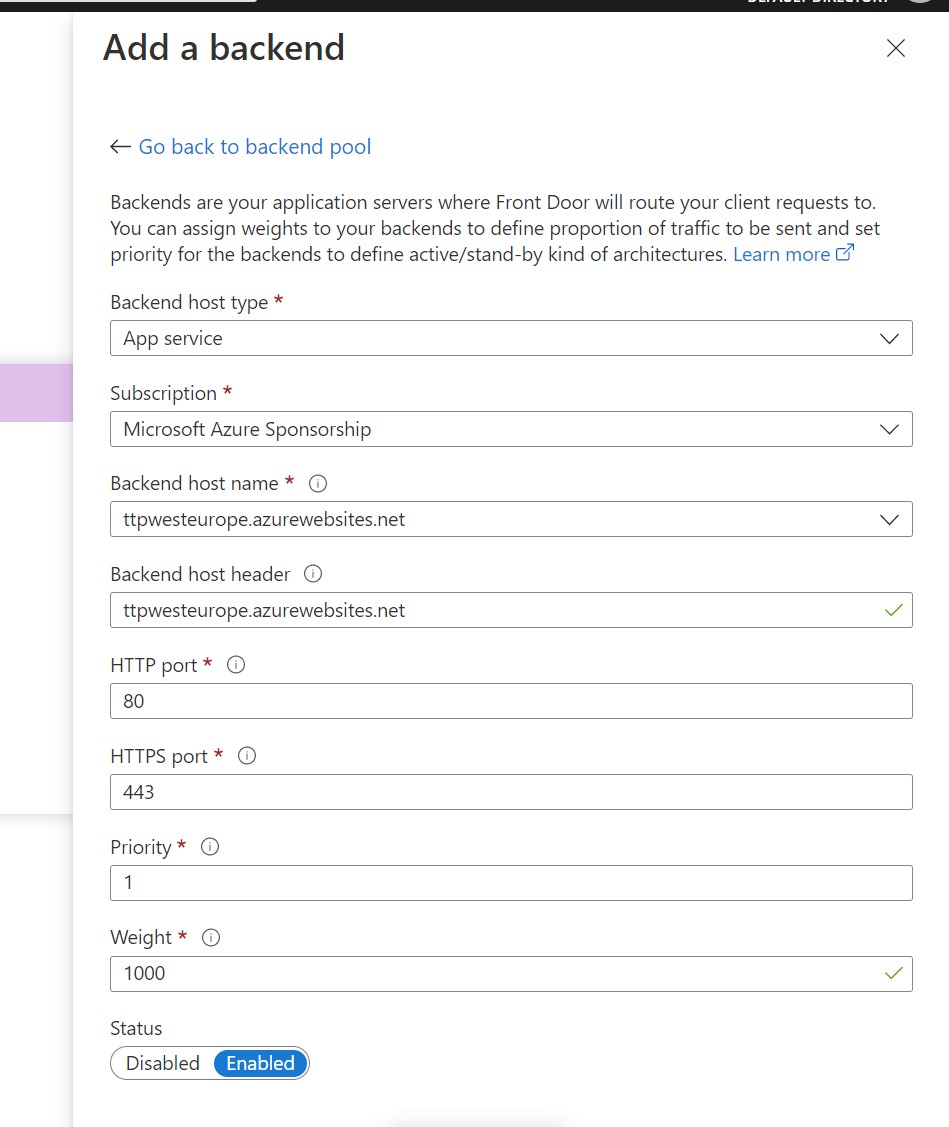 Here we provide the pool name, select App Service as Backend Host type, pick East US backend host name , Priority would be 1 and Wight is 1000 and click on Add.