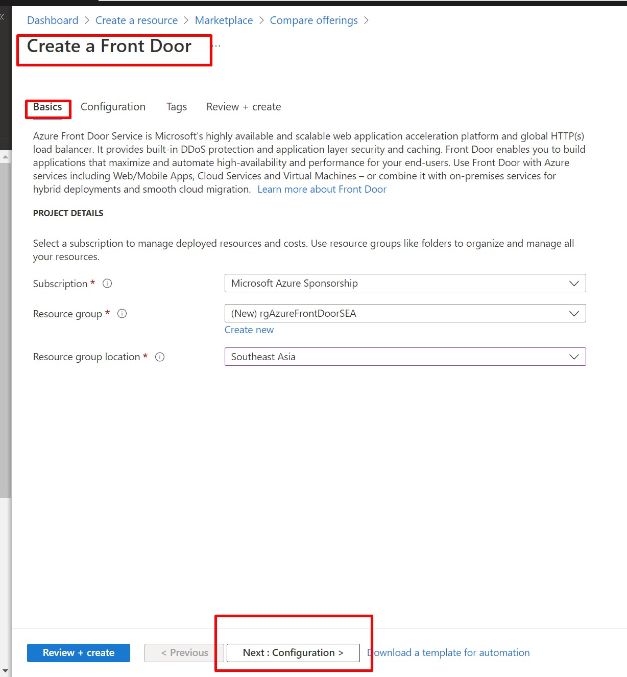 Next, on the Basic tab. Here we create new resource group in the South East ASIA location.