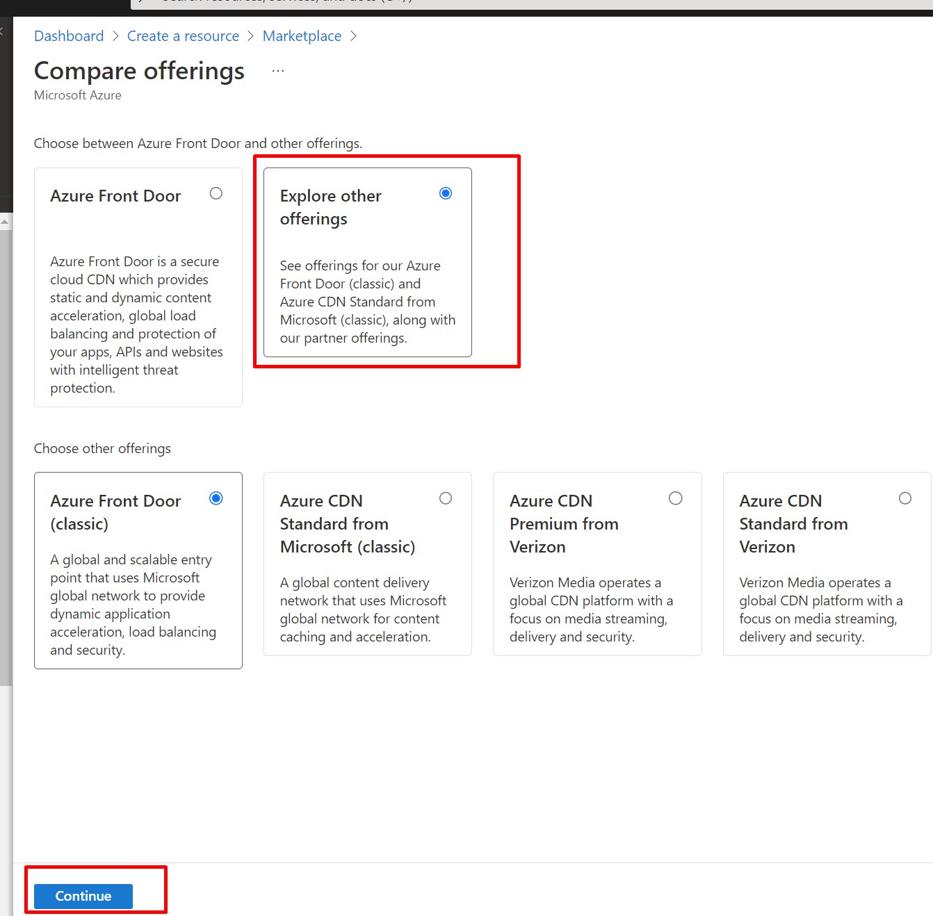 Now, From explore other offerings select Azure Front Door classics and click on Continue.