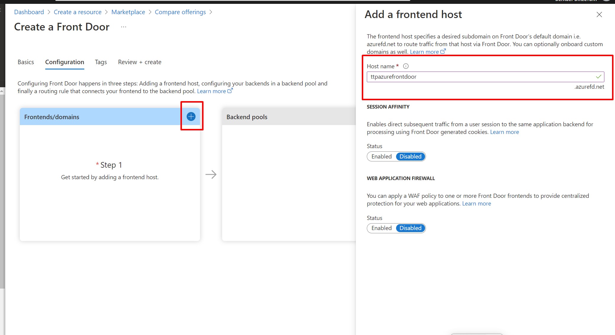 Next, click on Configuration tab, here for the Frontends/domain options we click on +(Add) button and provide host name for Azure Front Door. For time being, here we have Session Affinity status disabled and Web Application Firewall disabled and click on Add button.
