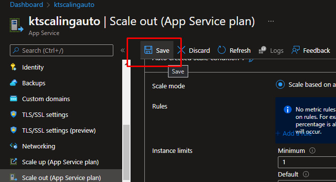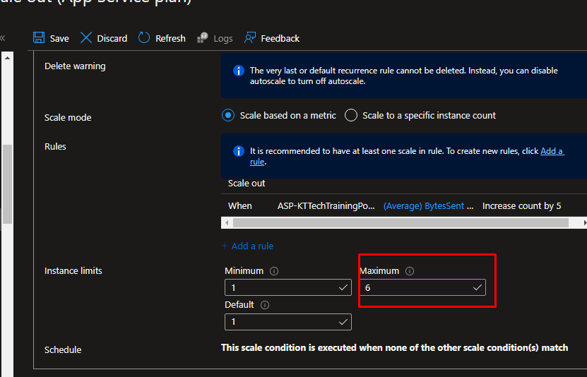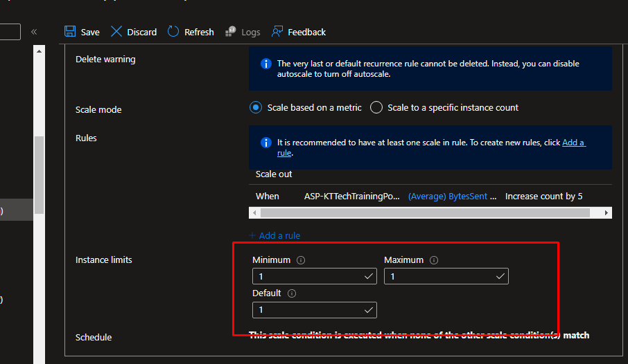 Additionally, you can also configure the instance limits of this scale condition so that it will have a minimum of one instance and a maximum of a specific number.