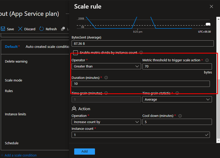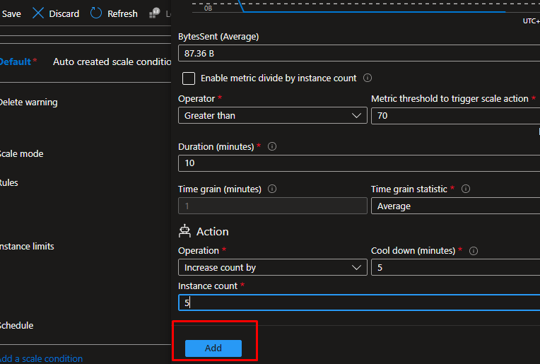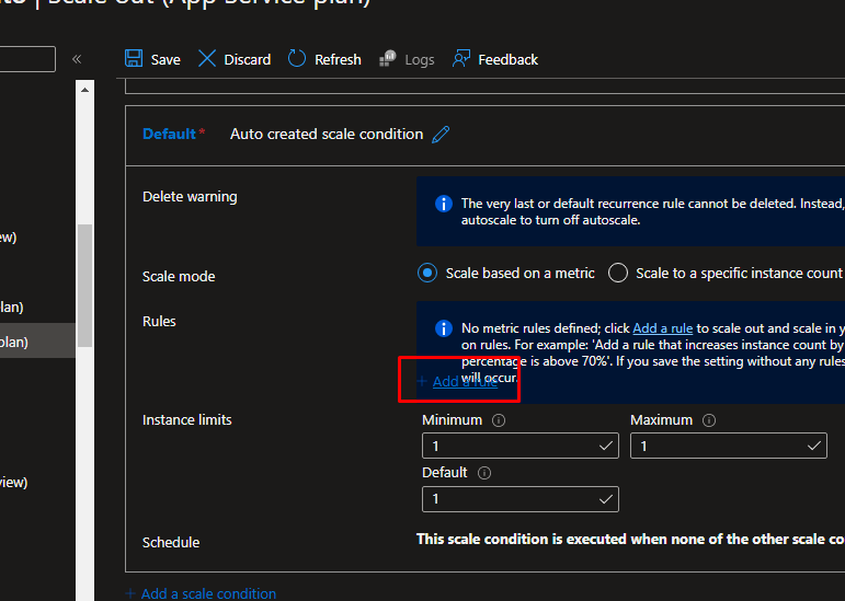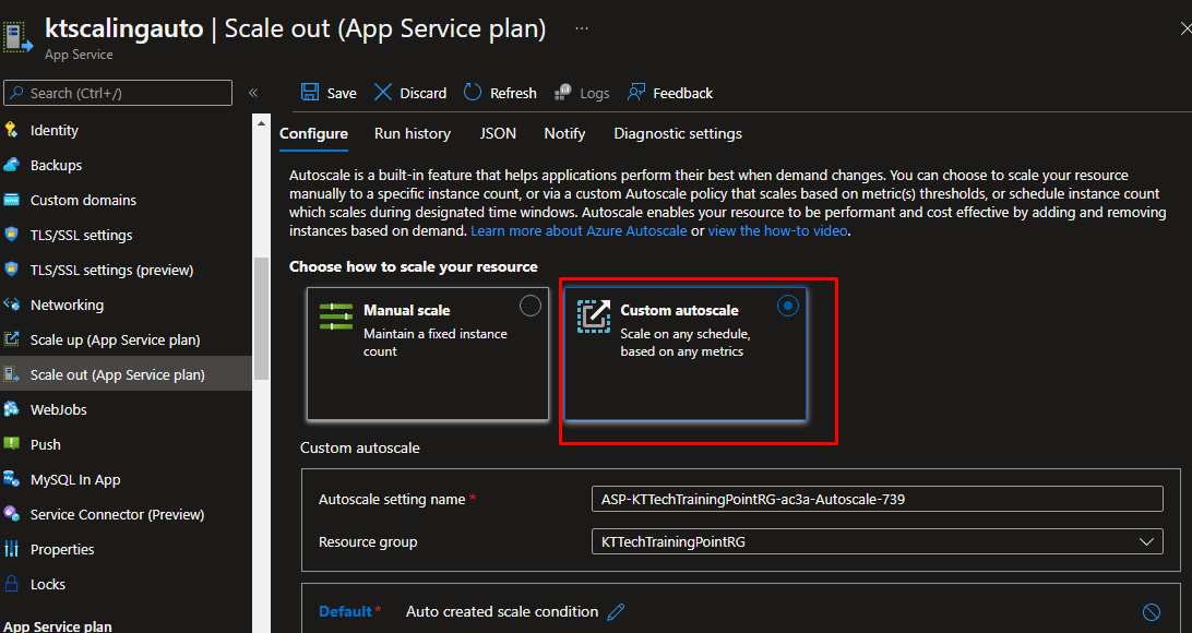We will be choosing custom autoscale. This works based on scale conditions. A condition will scale in and out based on rules. Let us see by adding a rule.
