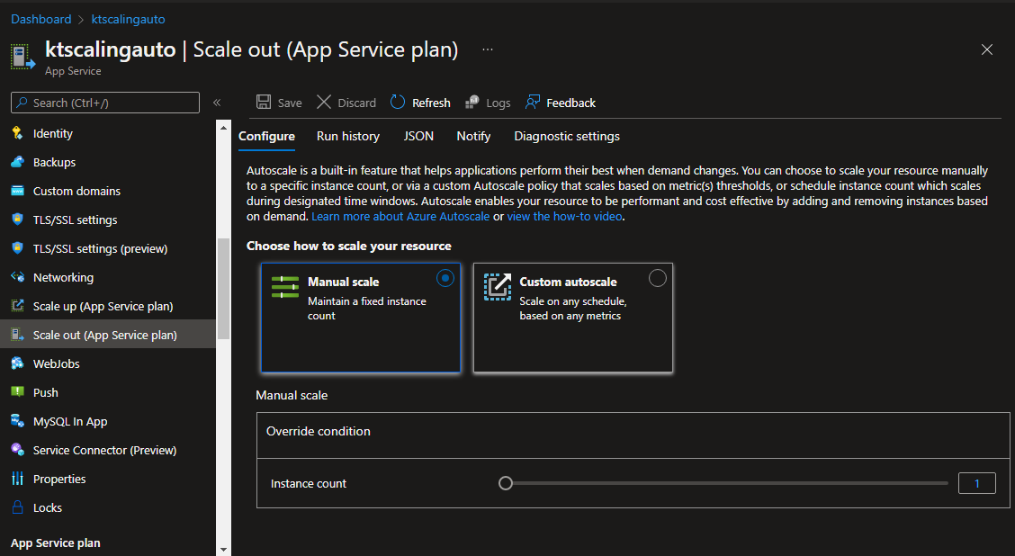 In that app service, I can go to the scale out menu and scale out and up my app manually.