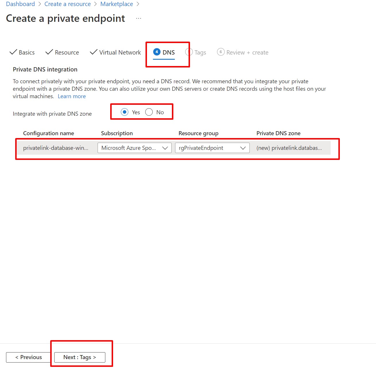 Next, go to DNS tab, make sure,integrate with Private DNS zone is enabled and go with the default Private DNS zone value. Here, we have selected our subscription and the resource group.