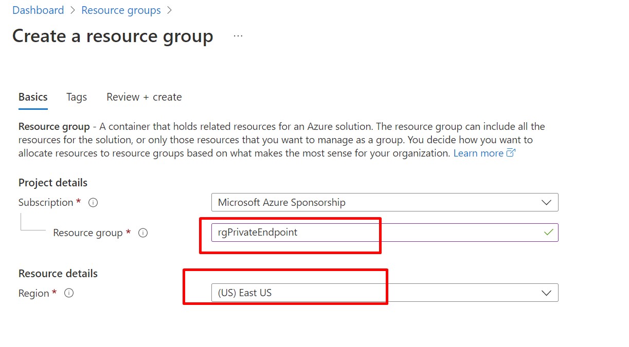 On the basic tab, we select the resource group which we have provisioned in the beginning of the exercise, provide Name and select the region and click on Resource Tab.