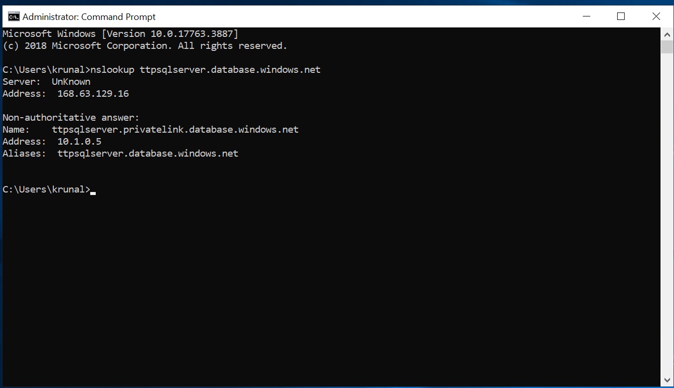 Now it’s time to test our private endpoint.Open command prompt and check the nslook up for your SQL Database server as shown here. In my case, I have used nslookup ttpsqlserver.database.windows.net. You would be seeing output as shown in the image below.
