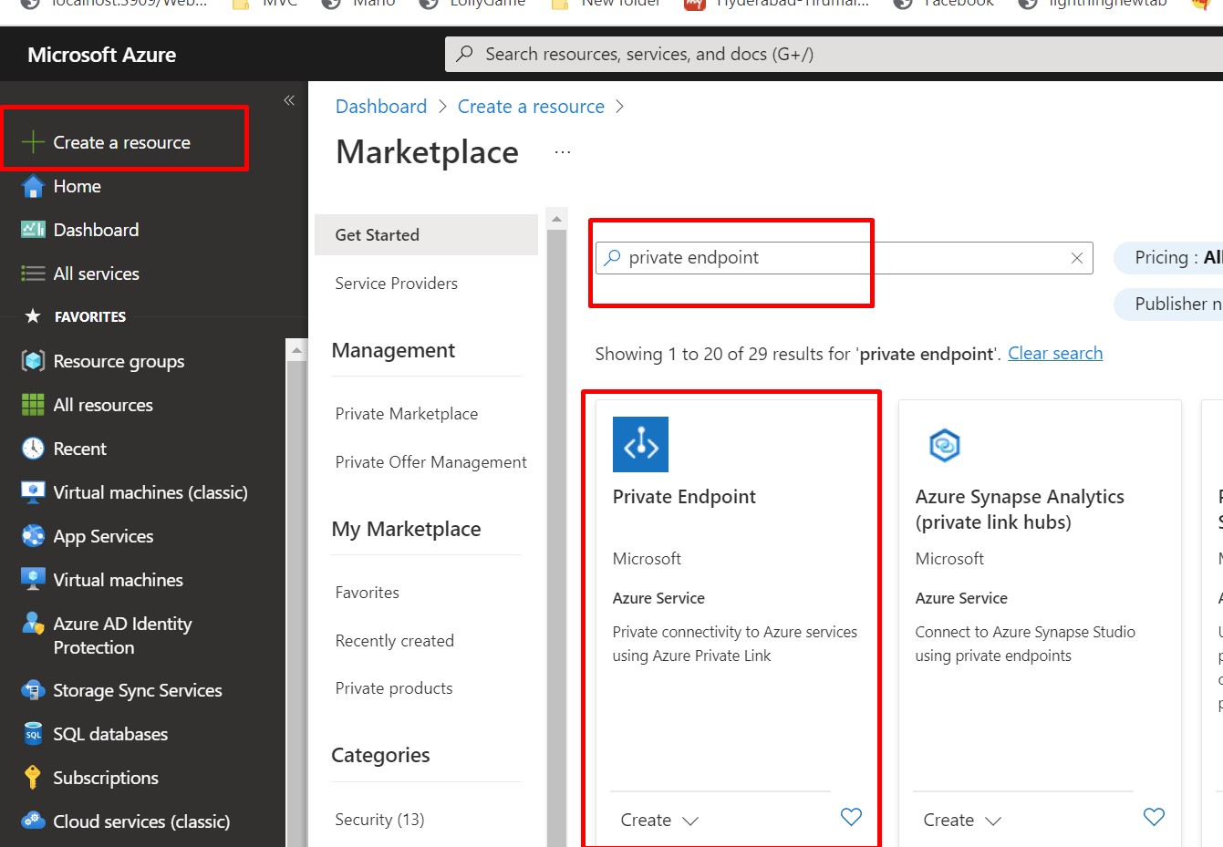 So Click on Create Resource and search for Private Endpoint a shown in the figure