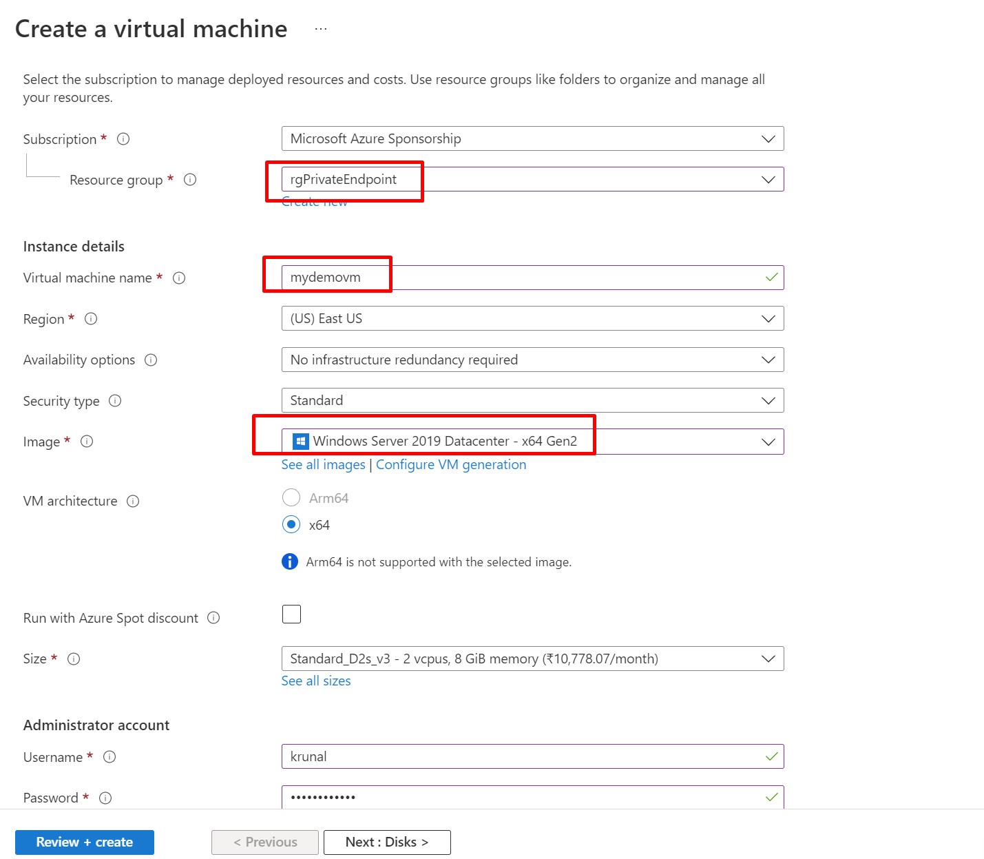 Now, we will create a Virtual Machine. Under the newly created Resource Group, we will provision Windows Server 2019 Datacenter VM. Provide the credentials.