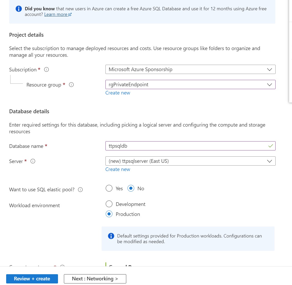 For that, Click on Create Resource and find out SQL Database. Now, Provision a new database under the resource group rgPrivateEndpoint. Here, we also need to create new SQL Server.