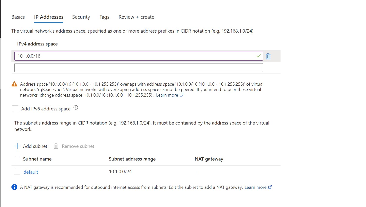 Set Address space for VNet is 10.1.0.0/16 and default subnet is 10.1.0..0/24 and click on Review+Create and Create.