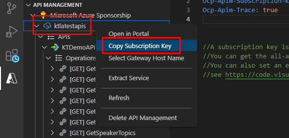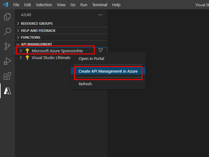 Back to the extensions tab, right click on your subscription name and click create API management in Azure.