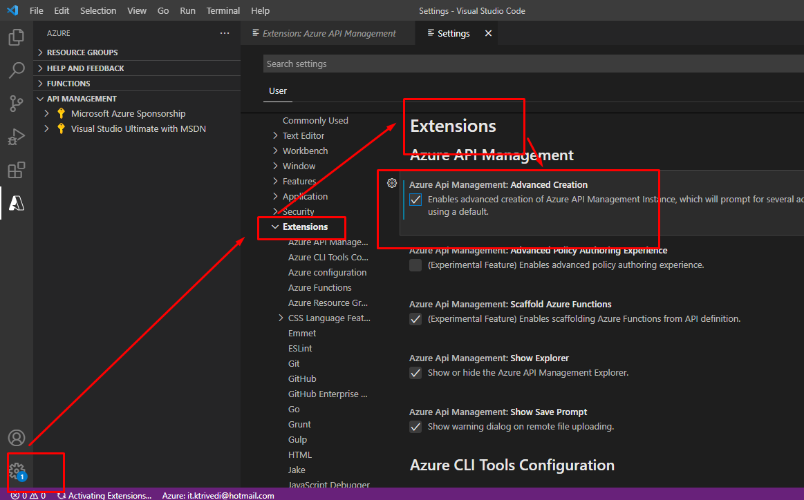 Once it gets installed, go to the extensions tab. You will find the API management extension there. Here you can see that I have Azure functions extension enabled as well. Also, once you install the extension, you need to sign in to Azure. I am already signed in here.