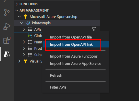 There are several ways you can import an API. From an OpenAPI file, from a link, Azure Functions or Azure App Services. Here we are going to import a sample from the OpenAPI link.