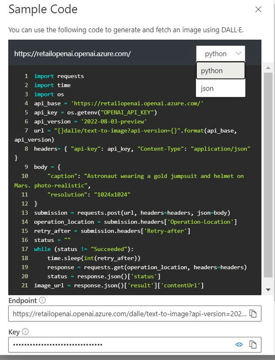 The sample code appears on the screen along with Endpoint and Key. The users can make use of it in the code editor.