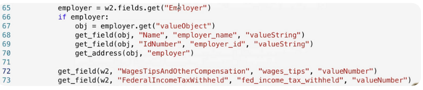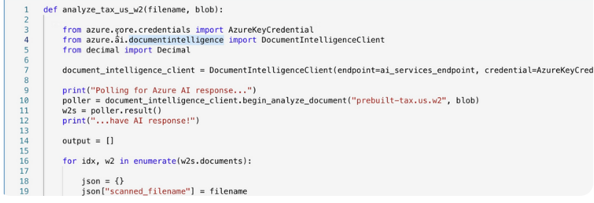 The top art of the analyze_tax_us_w2 function calls Azure AI at lines 7-11. There is a lot going on in three lines of code.