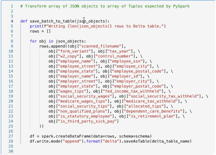 Line 23 saves the form data discovered by Document Intelligence to the Data Lake as a Delta table.